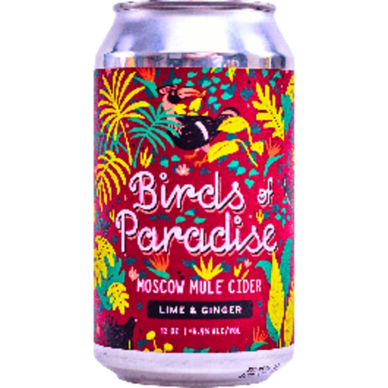 BIRDS OF PARADISE Moscow Mule Cider.Inspired Moscow Mule, Birds of Paradise starts with bright- zesty waves of lime and finishes with gentle notes of ginger and tart hibiscus.INGREDIENTS NY Hard Cider, Lime Concentrate, Hibiscus, Ginger Juice, Demerara Sug