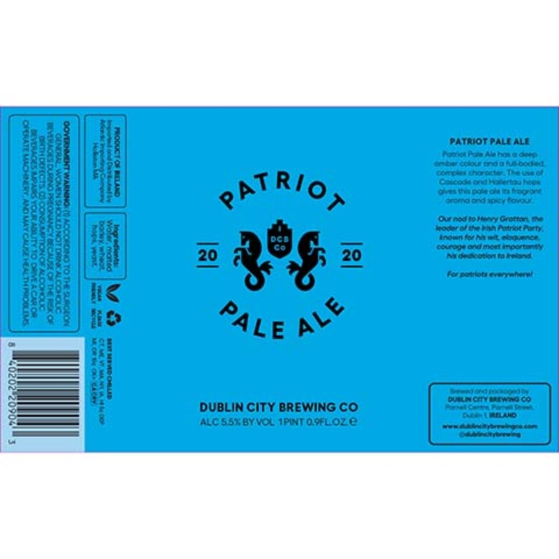 Pale Ale |5.5% ABVCommercial Description:Patriot Pale Ale has a deep amber colour and a full-bodied, complex character. The use of Cascade and Hallertau hops gives this pale ale its fragrant aroma and spicy flavour.