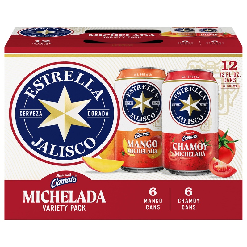 Estrella Jalisco Michelada variety pack includes 4X of our Mango Michelada 4X of our Tropical Chamoy and 4X of our Classic Michelada. Estrella Jaliscos Michelada Variety pack is sure to appeal to all michelada fans. With only 3.5 ABV Estrella Jaliscos mich
